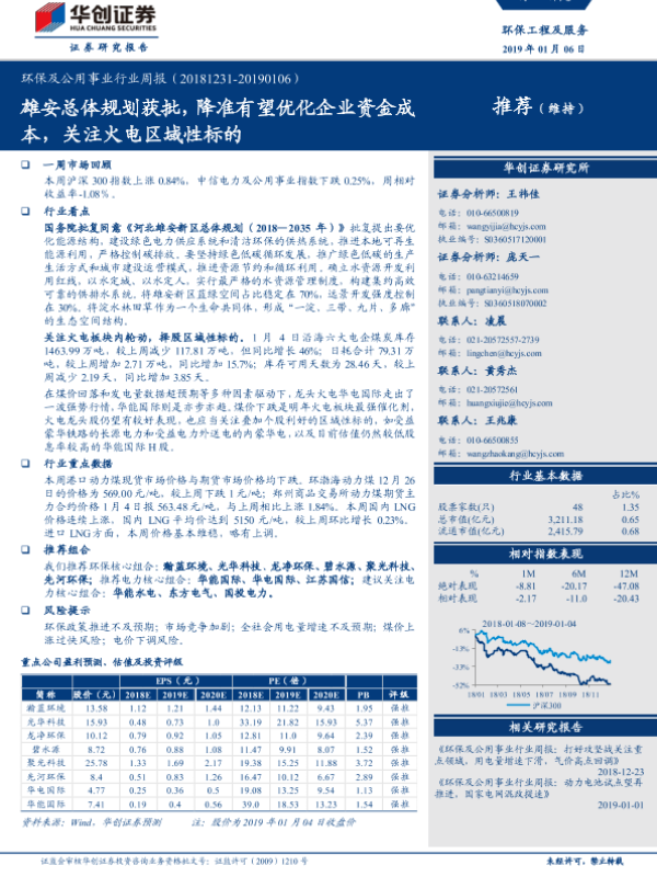 【华创证券】【20190106】环保及公用事业行业周报:雄安总体规划获批,降准有望优化企业资金成本,关注火电区域性标的-36页