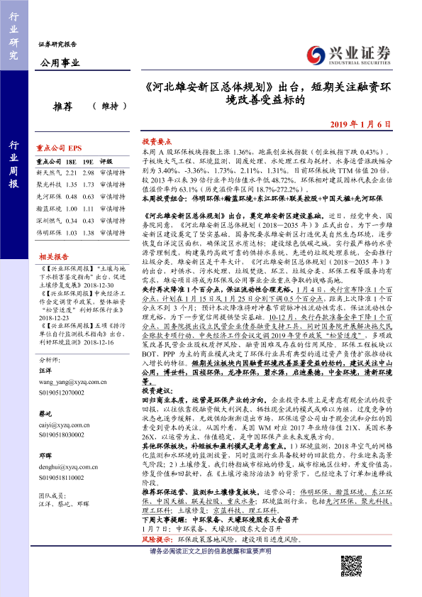 公用事业 总体规划 环保行业 融资环境 雄安新区