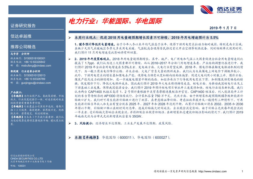 【信达证券】【20190107】电力行业:华能国际、华电国际-5页