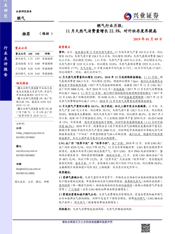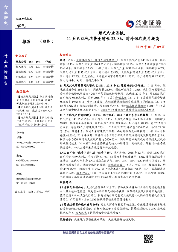 【兴业证券】【20190109】燃气行业月报:11月消费量同比增长22.8%,对外依存度继续提高-13页