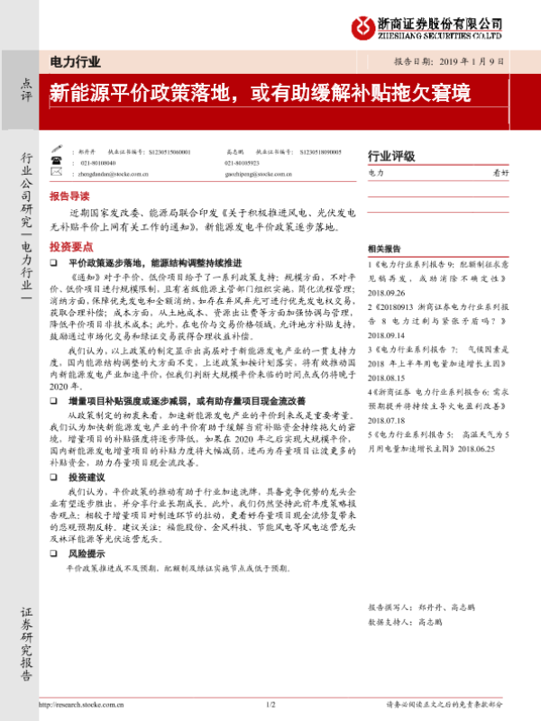 【浙商证券】【20190109】电力行业点评:新能源平价政策落地,或有助缓解补贴拖欠窘境-2页