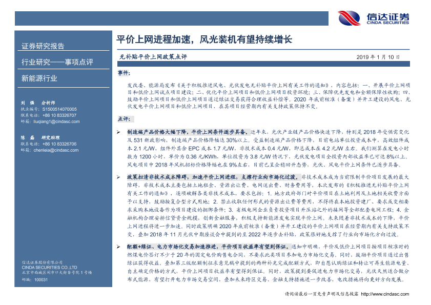 【信达证券】【20190110】无补贴平价上网政策点评:平价上网进程加速,风光装机有望持续增长-4页