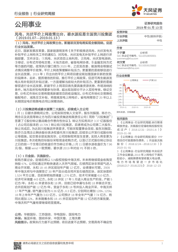 【天风证券】【20190113】公用事业行业研究周报:风电、光伏平价上网政策出台,碧水源拟易主国资川投集团-19页
