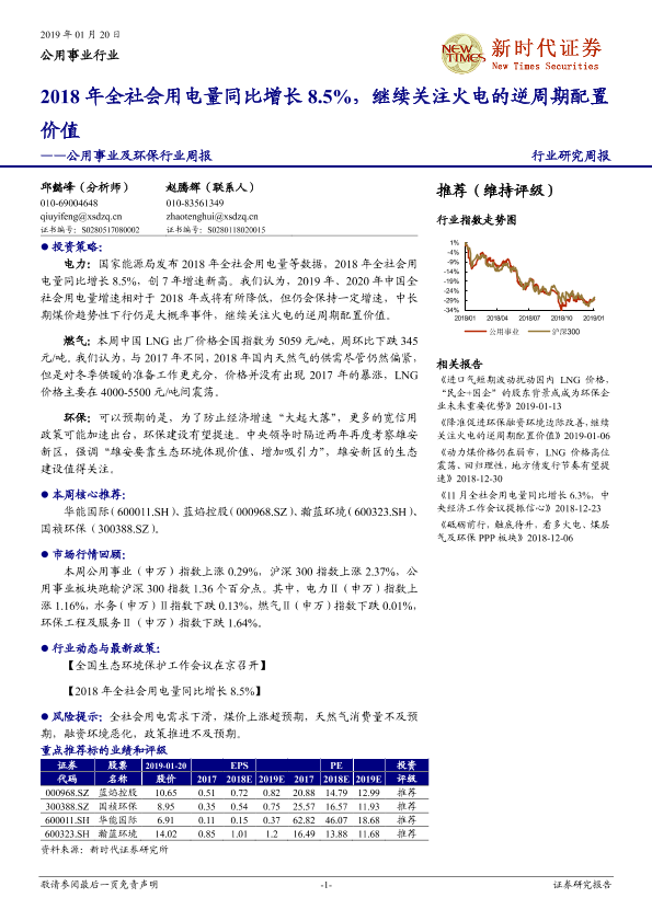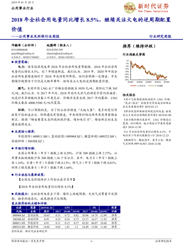 【新时代证券】【20190120】2018年全社会用电量同比增长8.5%,继续关注火电的逆周期配置价值-14页