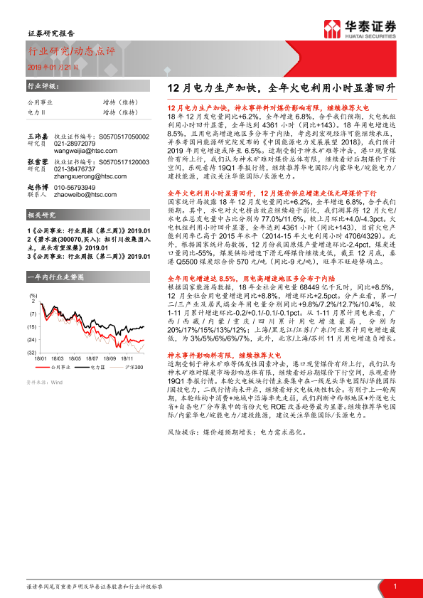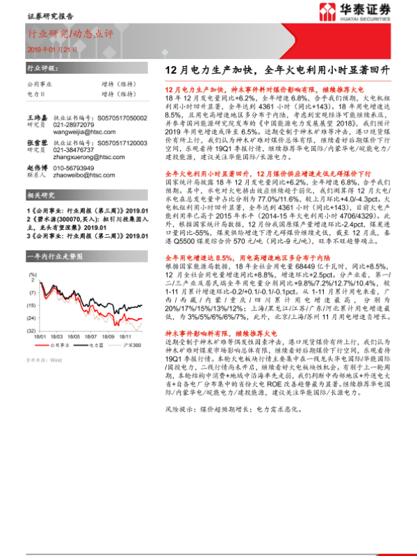 【华泰证券】【20190121】12月电力生产加快,全年火电利用小时显著回升-6页