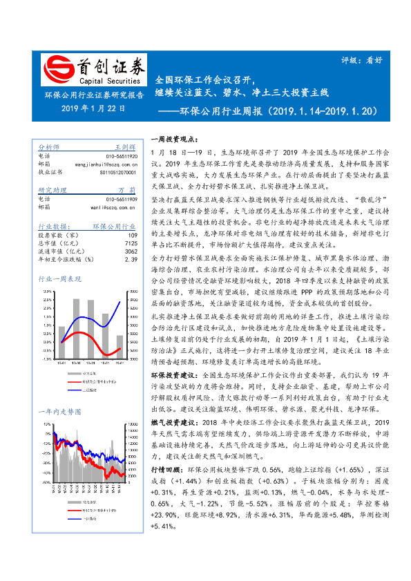 【首创证券】【20190122】环保公用行业周报:全国环保工作会议召开,继续关注蓝天、碧水、净土三大投资主线-13页