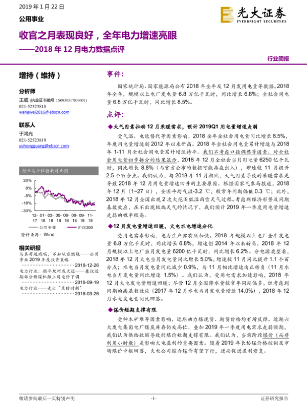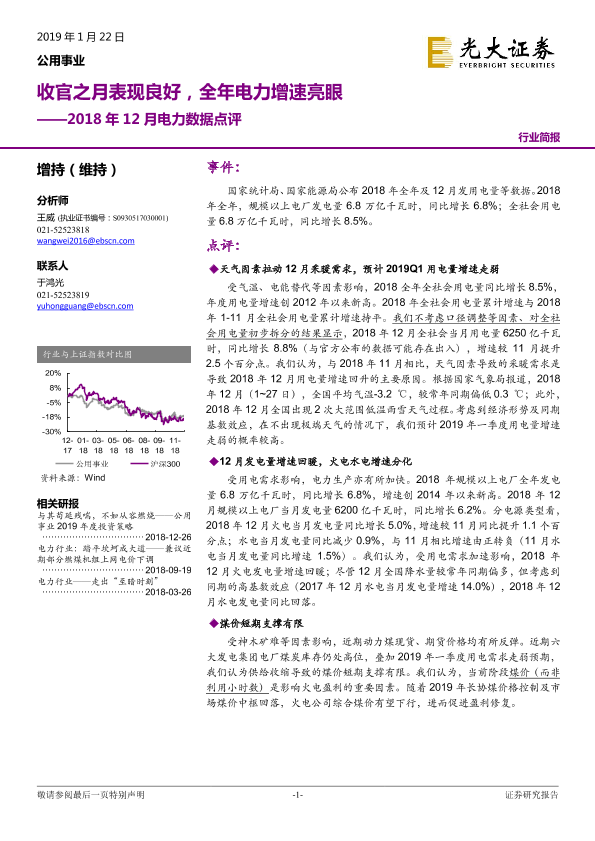 【光大证券】【20190122】2018年12月电力数据点评:收官之月表现良好,全年电力增速亮眼-6页