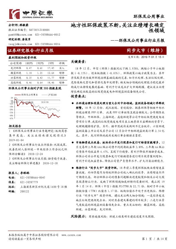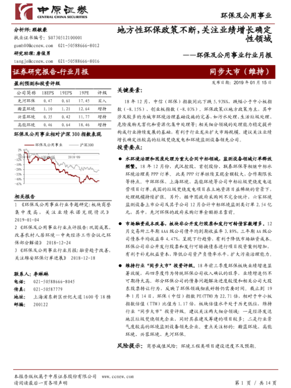 【中原证券】【20190115】环保及公用事业行业月报:地方性环保政策不断,关注业绩增长确定性领域-14页