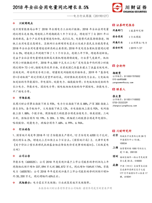 【川财证券】【20190127】2018年全社会用电量同比增长8.5%-12页