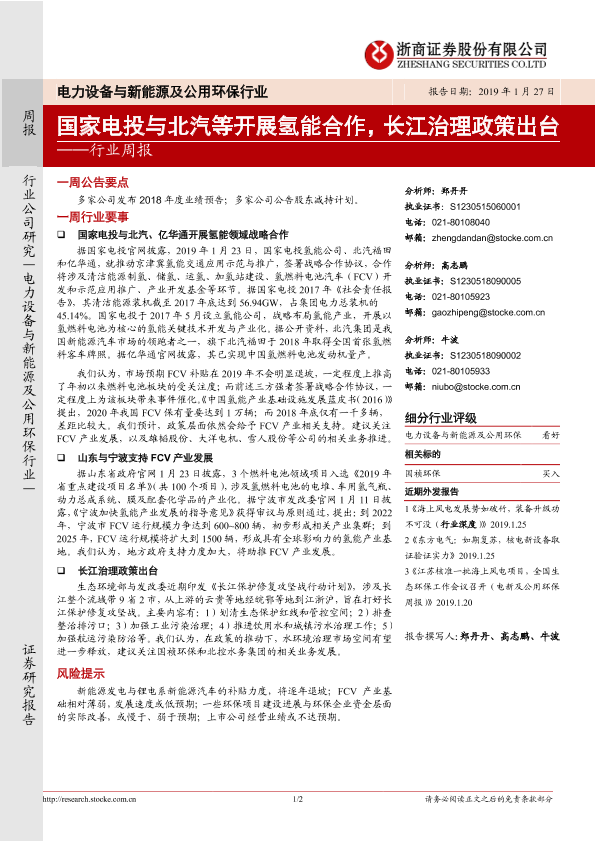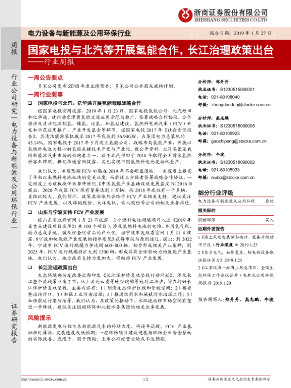 【浙商证券】【20190127】电力设备与新能源及公用环保行业周报:国家电投与北汽等开展氢能合作,长江治理政策出台-2页
