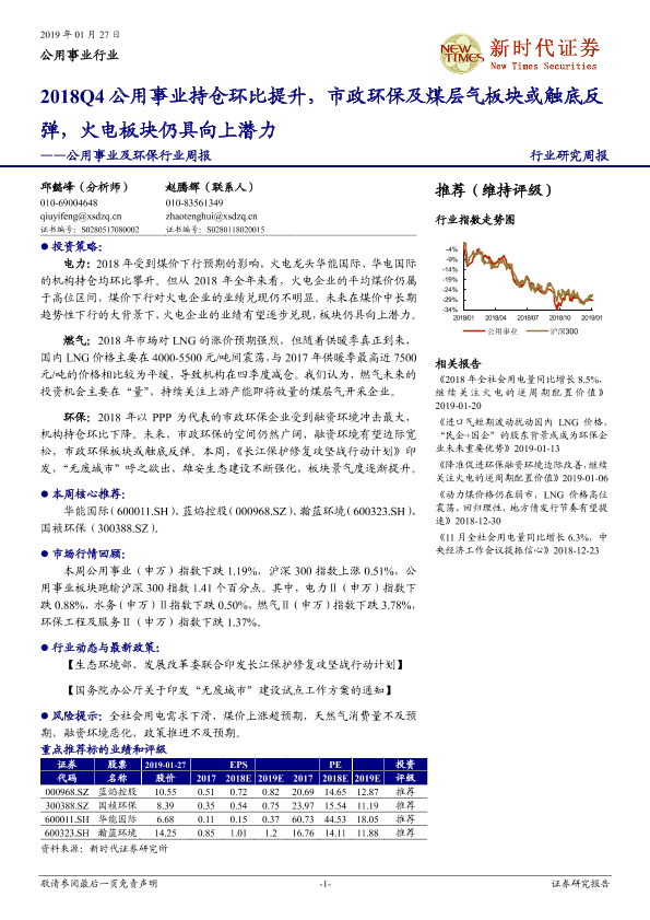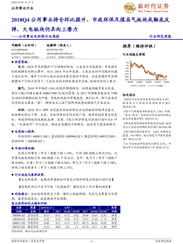 【新时代证券】【20190127】2018Q4公用事业持仓环比提升,市政环保及煤层气板块或触底反弹,火电板块仍具向上潜力-14页