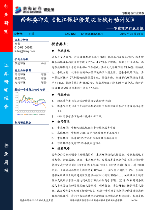 【渤海证券】【20190201】节能环保行业周报:两部委印发《长江保护修复攻坚战行动计划》-16页