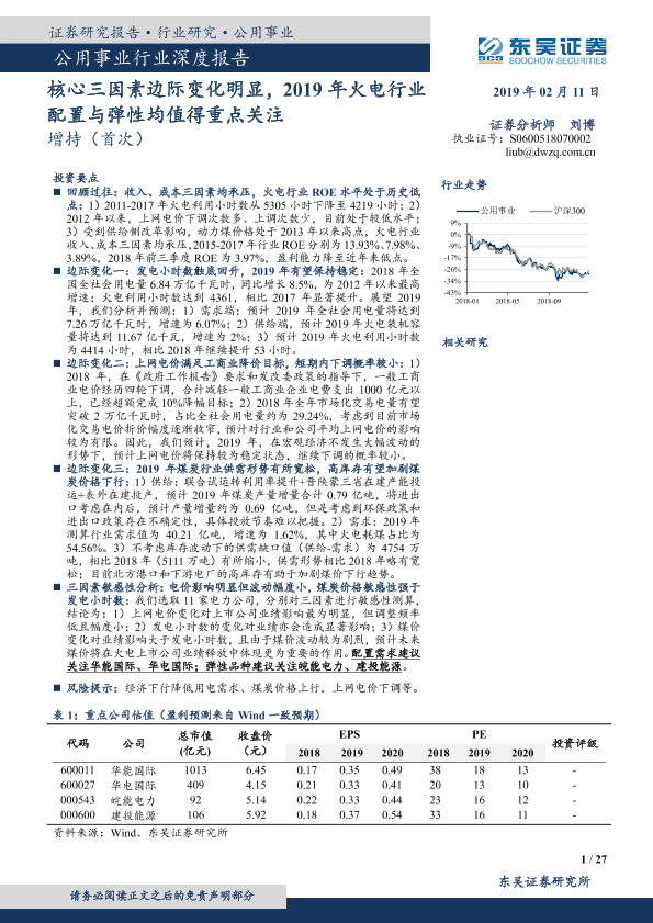 【东吴证券】【20190211】公用事业行业深度报告:核心三因素边际变化明显,2019年火电行业配置与弹性均值得重点关注-27页