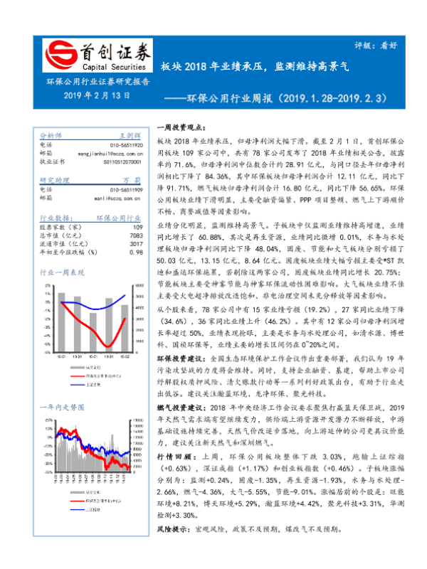 【首创证券】【20190213】环保公用行业周报:板块2018年业绩承压,监测维持高景气-19页