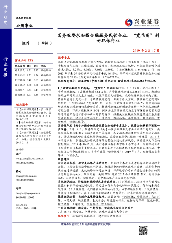 【兴业证券】【20190217】公用事业行业周报:国务院要求加强金融服务民营企业,“宽信用”利好环保行业-12页