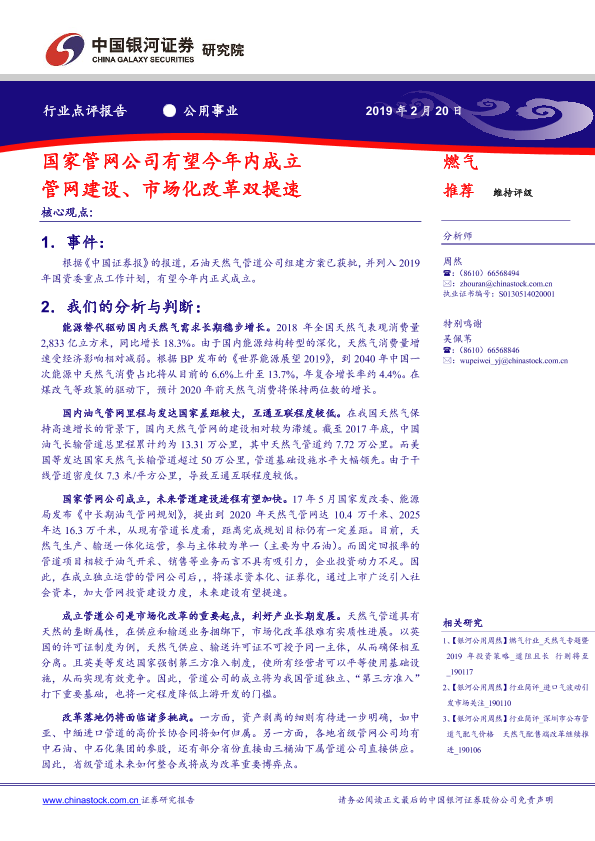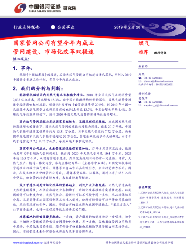【银河证券】【20190220】公用事业行业点评报告:国家管网公司有望今年内成立管网建设、市场化改革双提速-4页