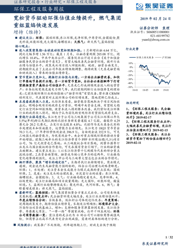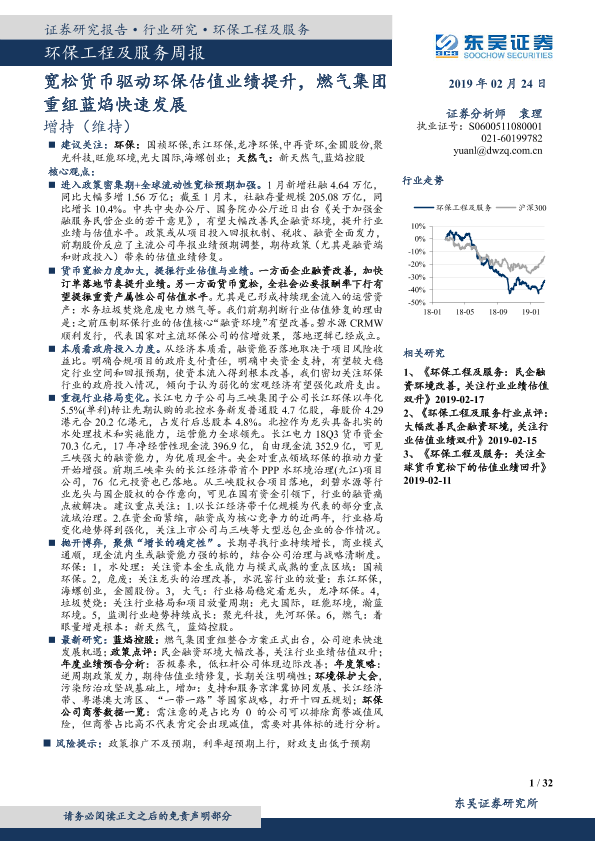 【东吴证券】【20190224】环保工程及服务周报:宽松货币驱动环保估值业绩提升,燃气集团重组蓝焰快速发展-32页