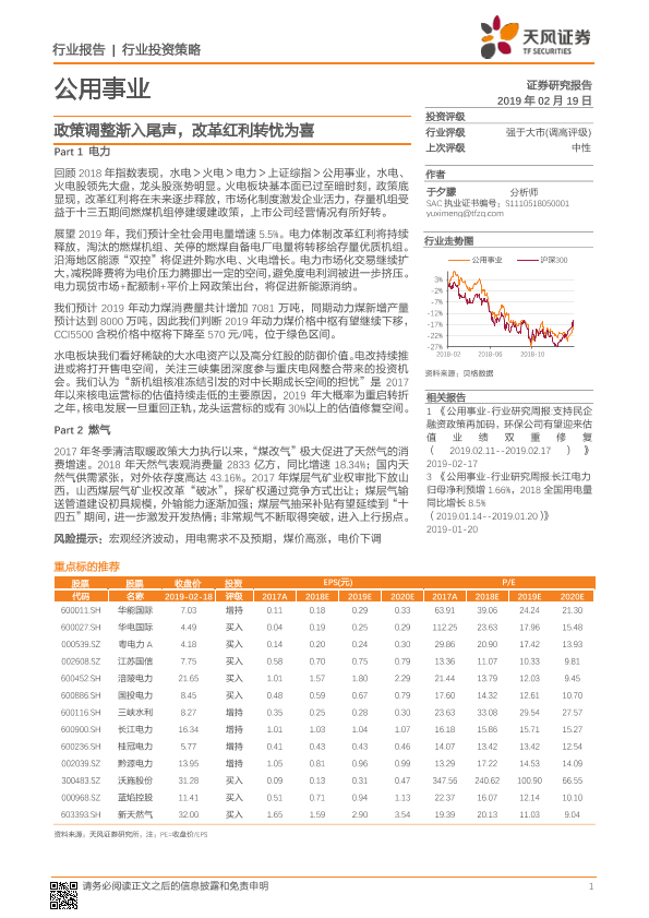 【天风证券】【20190219】公用事业行业投资策略:政策调整渐入尾声,改革红利转忧为喜-67页