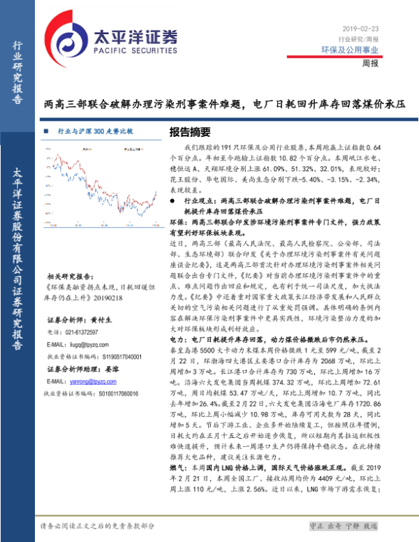 【太平洋证券】【20190223】两高三部联合破解办理污染刑事案件难题,电厂日耗回升库存回落煤价承压-16页