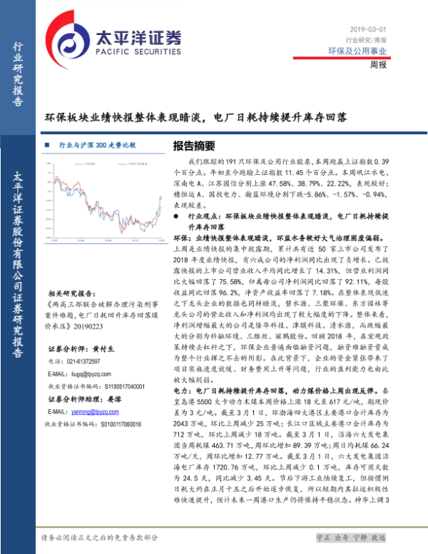 【太平洋证券】【20190301】环保及公用事业周报:环保板块业绩快报整体表现暗淡,电厂日耗持续提升库存回落-18页