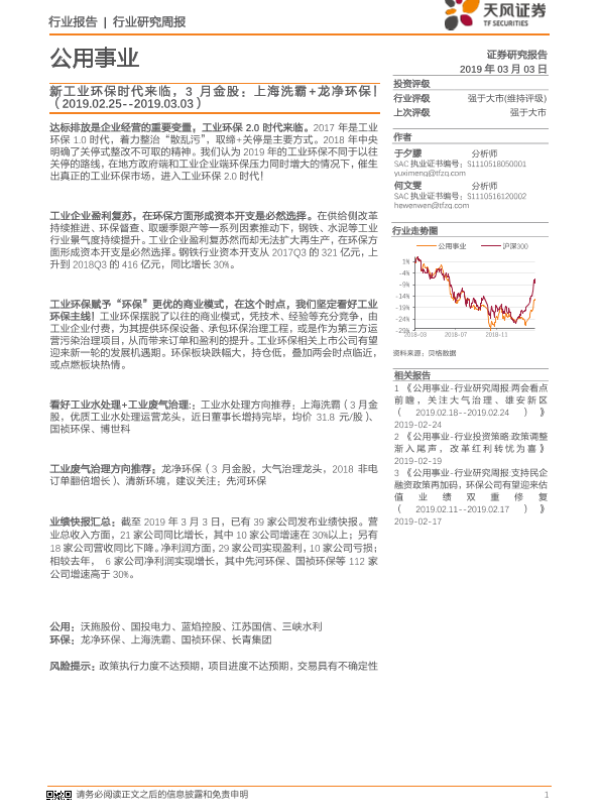 【天风证券】【20190303】公用事业行业研究周报:新工业环保时代来临-16页