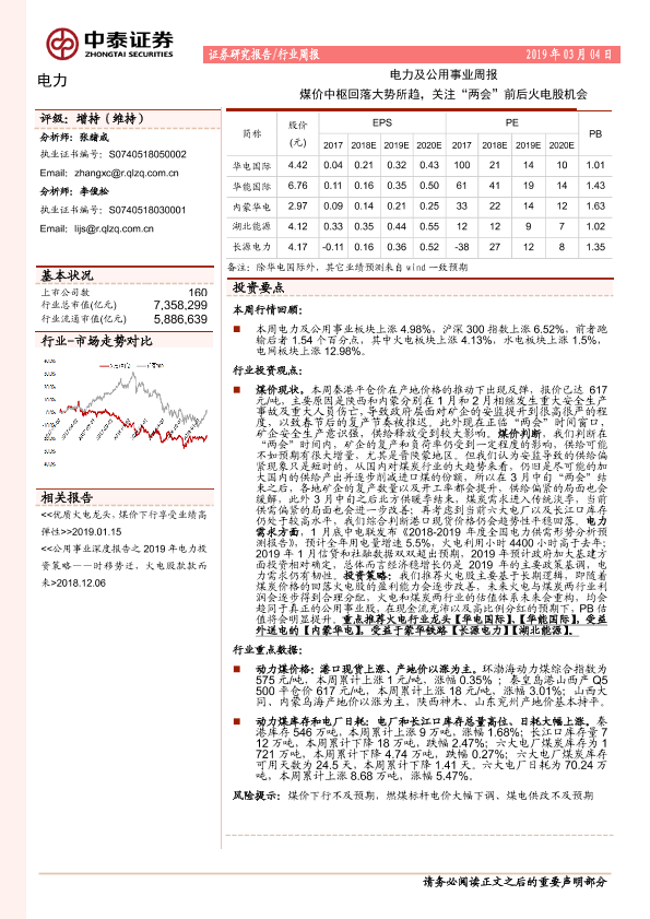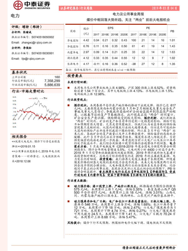 【中泰证券】【20190304】电力及公用事业周报:煤价中枢回落大势所趋,关注“两会”前后火电股机会-16页