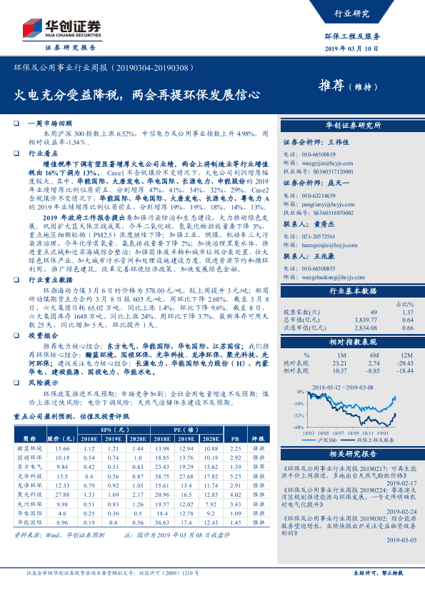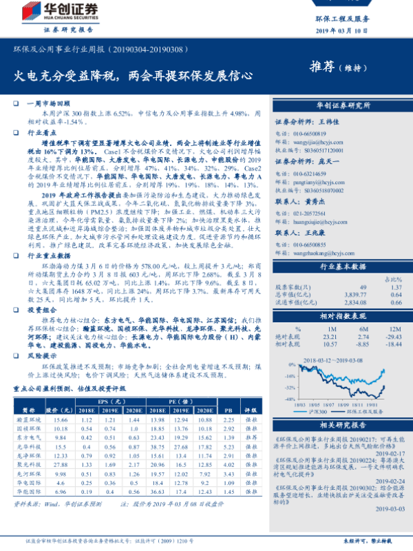 【华创证券】【20190310】环保及公用事业行业周报:火电充分受益降税,两会再提环保发展信心-36页