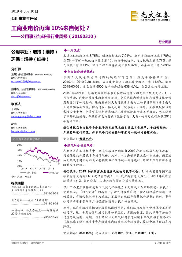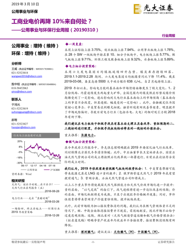 【光大证券】【20190310】公用事业与环保行业周报:工商业电价再降10%来自何处?-22页
