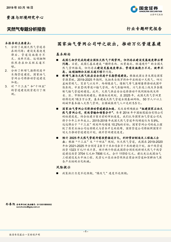 【国金证券】【20190316】天然气专题分析报告:国家油气管网公司呼之欲出,推动万亿管道基建-14页
