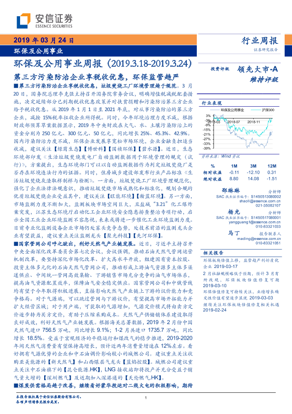 【安信证券】【20190324】环保及公用事业周报:第三方污染防治企业享税收优惠,环保监管趋严-16页