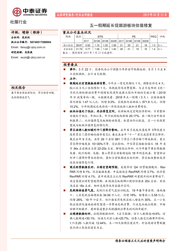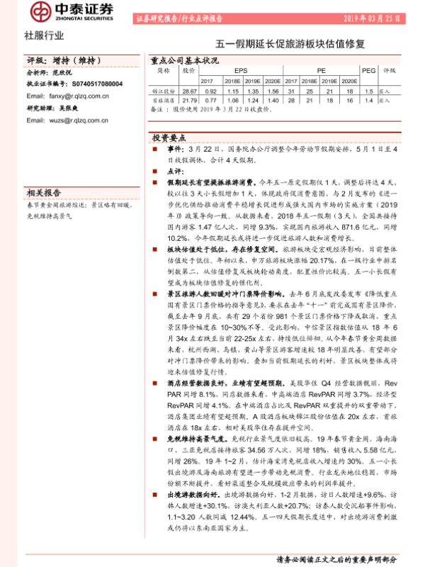 【中泰证券】【20190325】社服行业点评报告:五一假期延长促旅游板块估值修复-4页