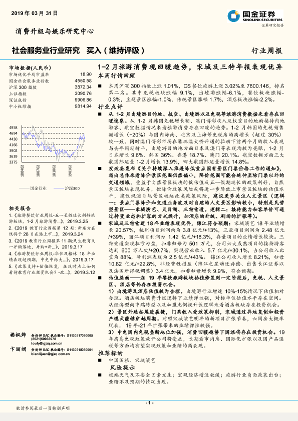 【国金证券】【20190331】社会服务业行业研究周报:1-2月旅游消费现回暖趋势,宋城及三特年报表现优异-11页