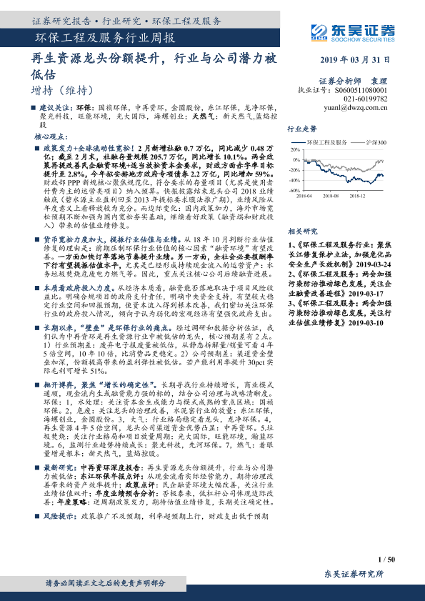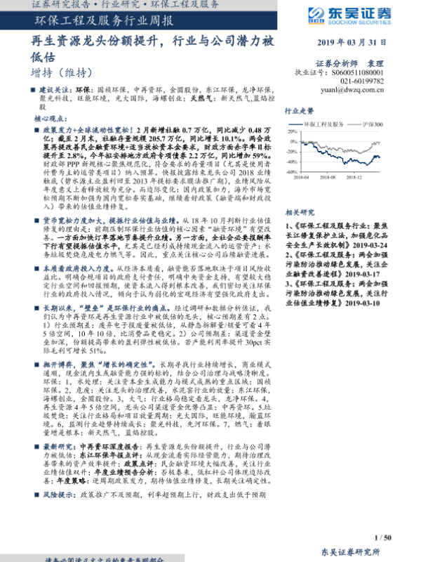 【东吴证券】【20190331】环保工程及服务行业周报:再生资源龙头份额提升,行业与公司潜力被低估-50页