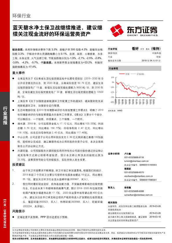 【东方证券】【20190401】环保行业周报:蓝天碧水净土保卫战继续推进,建议继续关注现金流好的环保运营类资产-17页