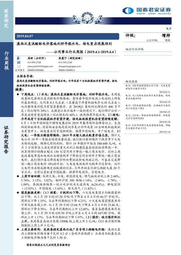 【国泰君安证券】【20190407】滇西北直流输配电价落地利好华能水电,核电重启进展顺利-13页