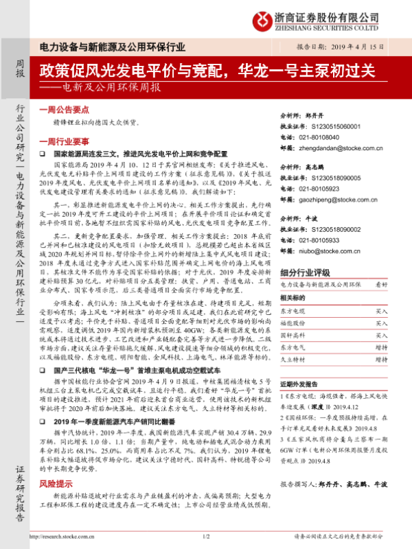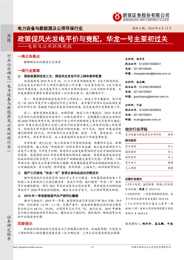 【浙商证券】【20190415】电新及公用环保周报:政策促风光发电平价与竞配,华龙一号主泵初过关-2页