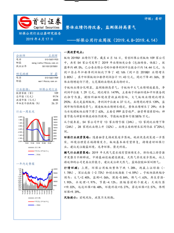 【首创证券】【20190417】环保公用行业周报:整体业绩仍待改善,监测保持高景气-16页