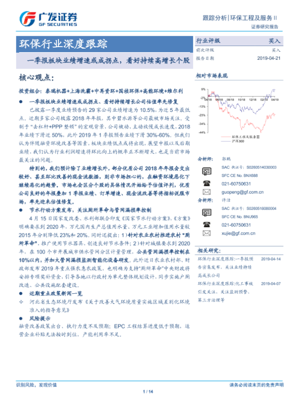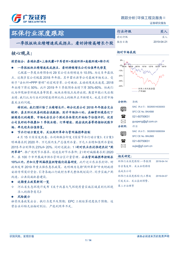 【广发证券】【20190421】环保行业深度跟踪:一季报板块业绩增速或成拐点,看好持续高增长个股-14页