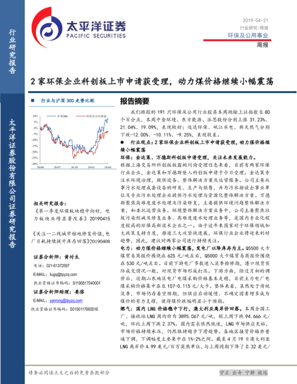 【太平洋证券】【20190421】环保及公用事业行业周报:2家环保企业科创板上市申请获受理,动力煤价格继续小幅震荡-16页