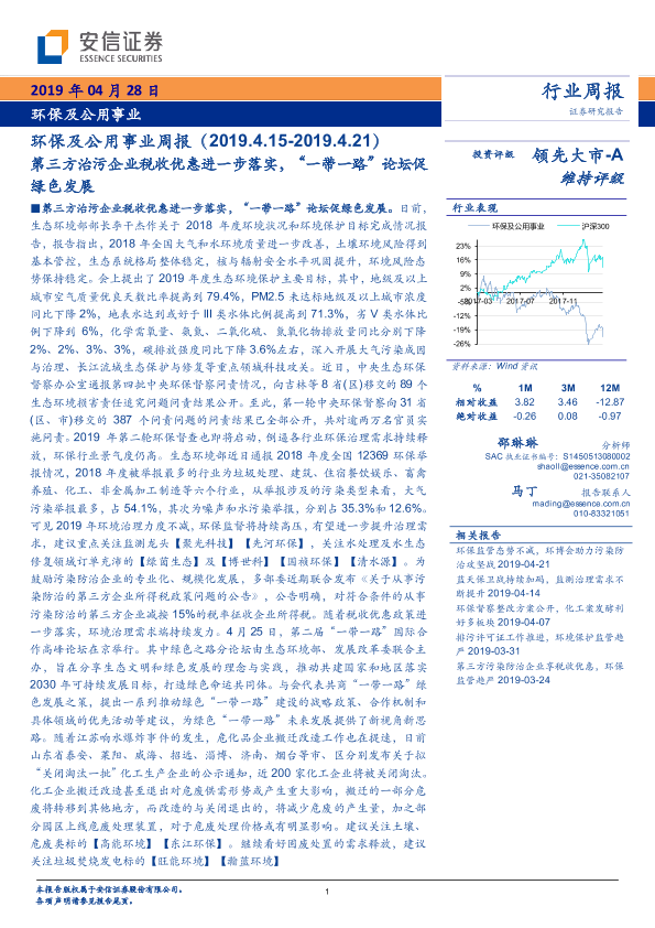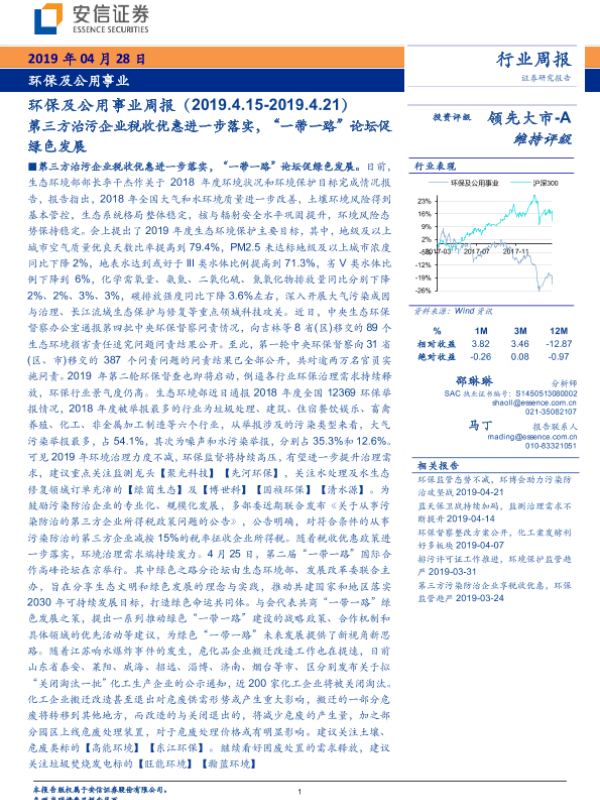 【安信证券】【20190428】环保及公用事业周报:第三方治污企业税收优惠进一步落实,“一带一路”论坛促绿色发展-15页