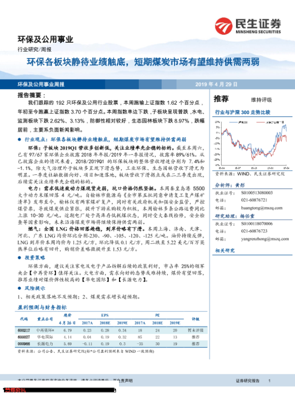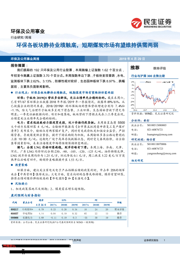 【民生证券】【20190429】环保及公用事业行业周报:环保各板块静待业绩触底,短期煤炭市场有望维持供需两弱-13页