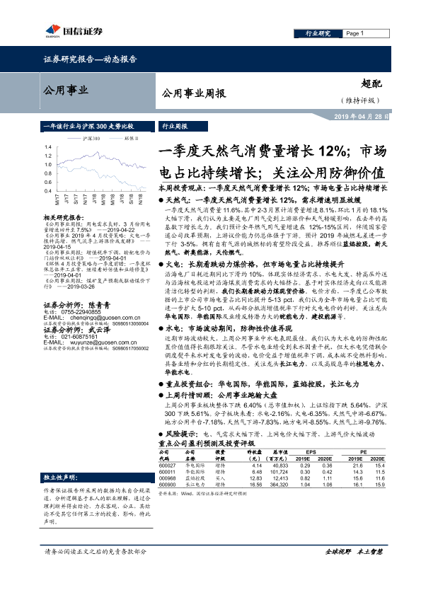 【国信证券】【20190428】公用事业周报:一季度天然气消费量增长12%;市场电占比持续增长;关注公用防御价值-9页