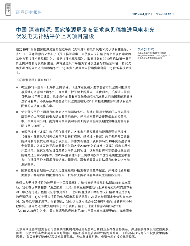 【Goldman Sachs】【20190411】中国清洁能源:国家能源局发布征求意见稿推进风电和光伏发电无补贴平价上网项目建设-4页