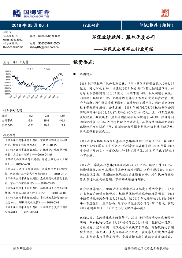 【国海证券】【20190506】环保及公用事业行业周报:环保业绩放缓,聚焦优质公司-10页