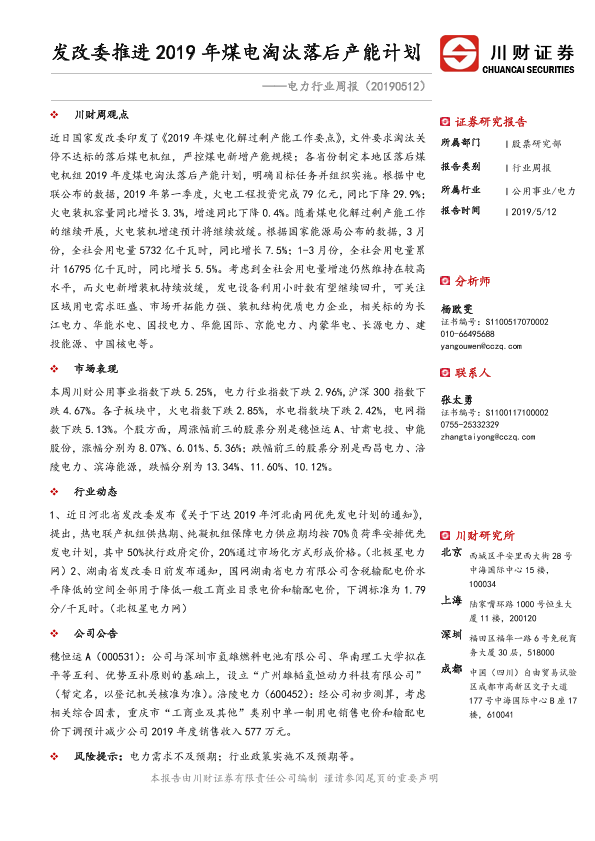 【川财证券】【20190512】电力行业周报:发改委推进2019年煤电淘汰落后产能计划-10页