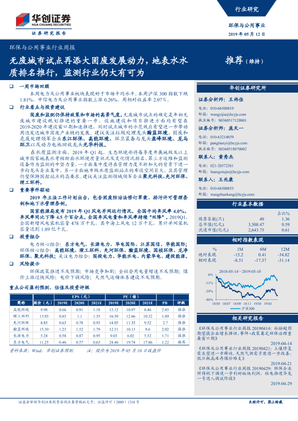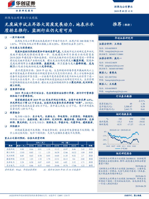 【华创证券】【20190512】环保与公用事业行业周报:无废城市试点再添大固废发展动力,地表水水质排名推行,监测行业仍大有可为-35页