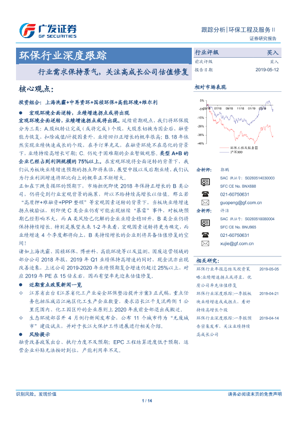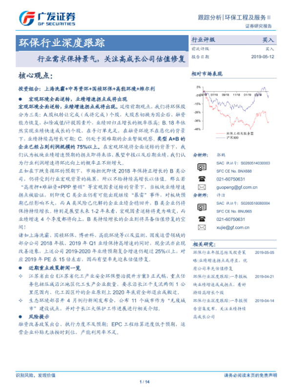 【广发证券】【20190512】环保行业深度跟踪:行业需求保持景气,关注高成长公司估值修复-14页
