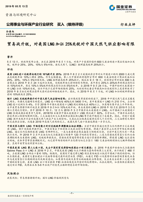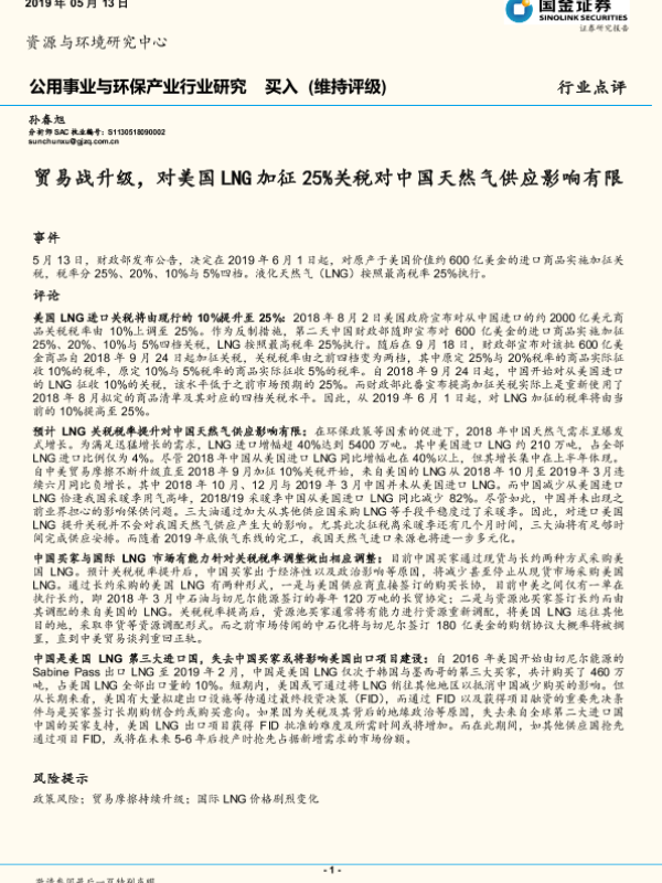 【国金证券】【20190513】贸易战升级,对美国LNG加征25%关税对中国天然气供应影响有限-3页