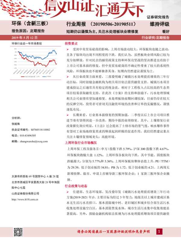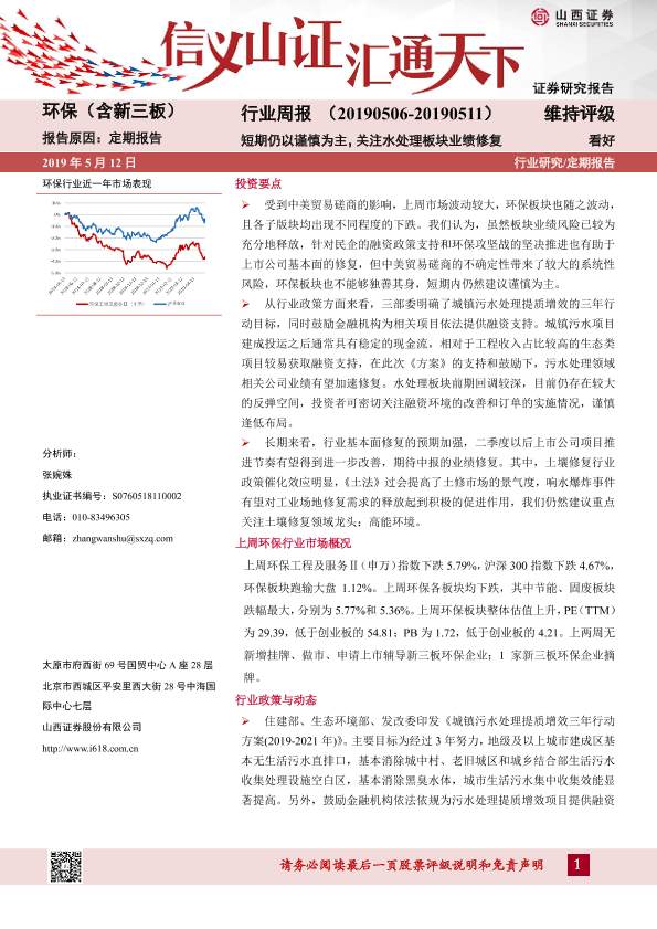 【山西证券】【20190512】环保(含新三板)行业周报:短期仍以谨慎为主,关注水处理板块业绩修复-12页