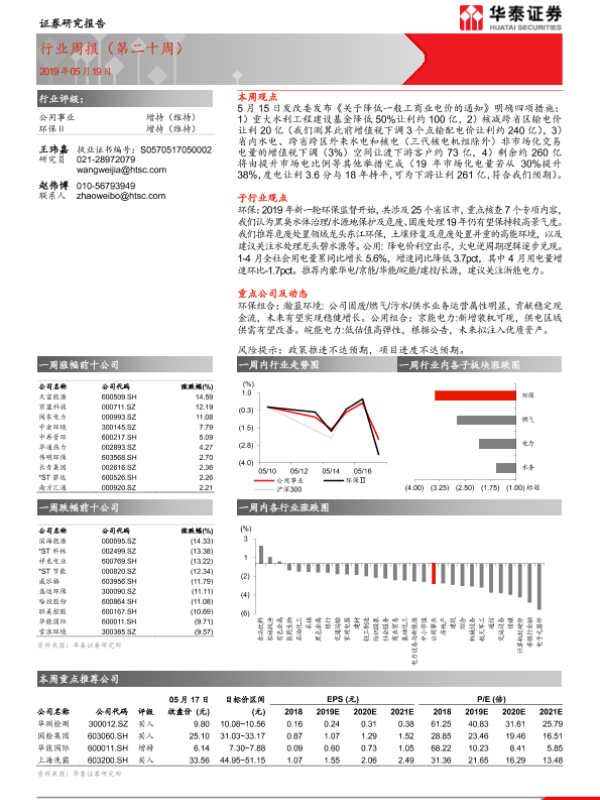 【华泰证券】【20190519】公用事业行业周报(第二十周)-12页